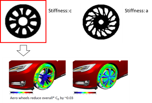 Figure 14: Example of Design Evaluation of car wheels in GD. Besides the stiffness available along with the designs, further engineering performance evaluation (e.g., aerodynamic performance evaluation) can be performed.