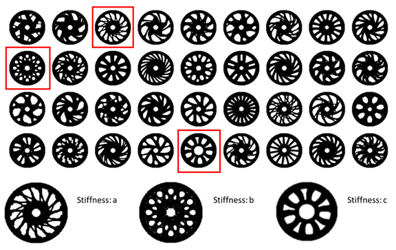 Given the explicitly defined constraints and objectives as input, the GD method can now automatically generate a large number of design options. The designer could review the generated solutions and select the most promising options for further exploration. They could use visualization and analysis tools to understand the performance and behavior of each solution. For example, in the car wheel design problem, there are three designs highlighted in the figure below that the designer finds appealing. Human preferences are essential for assessing and choosing designs in situations where non-engineering factors (e.g., the design’s aesthetics) are critical. These designs can be chosen for further evaluation, including an assessment of their engineering performance (i.e., the stiffness of the car wheel), which has been calculated during the generative design process.