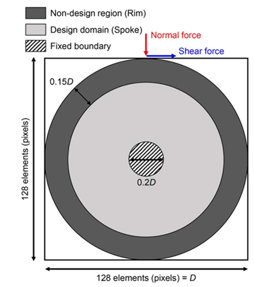 Figure 12: Example of the Problem Definition for car wheel design in GD. The figure sketches the design domain and boundary conditions, which serve as the design constraints. The objective can be set to maximize the stiffness of the car wheel.