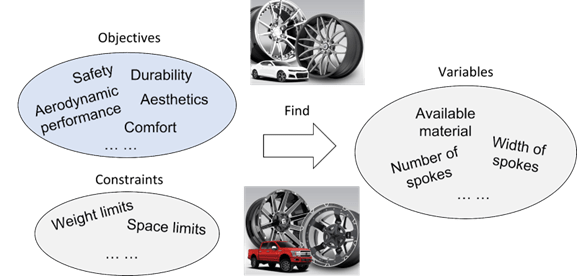 - Example(s): ”For example, two main objectives in car wheel design are wheel strength and wheel speed. First, think about designing a wheel optimized for strength. What are the strongest and most durable materials? How wide should the spokes be? In this case, the designer may choose a heavy material to add strength, and utilize wide spoke width to more equally distribute pressure along the inside of the wheel. Now, imagine you are designing a wheel optimized for speed. How would this be different from the previous wheel? Are lighter materials available? How can aerodynamics be improved? A lighter material will reduce the weight of the vehicle but may sacrifice strength. Exploring the “edges” of the design space will often help the designer understand how these variables impact design performance.”